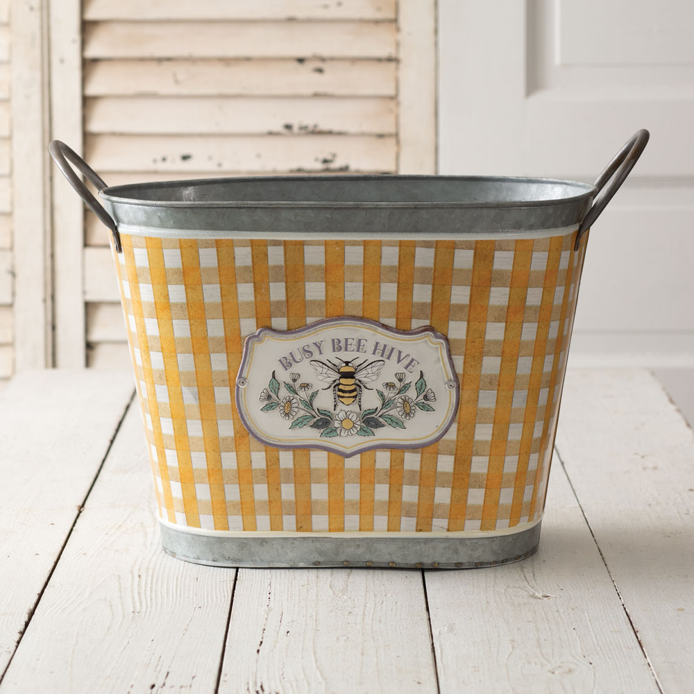 The busy bee hive bucket is galvanized metal on the inside and has a checkered yellow outer shell. It features two metal handles and a plaque on the front that has a honeybee and reads ''busy bee hive.''